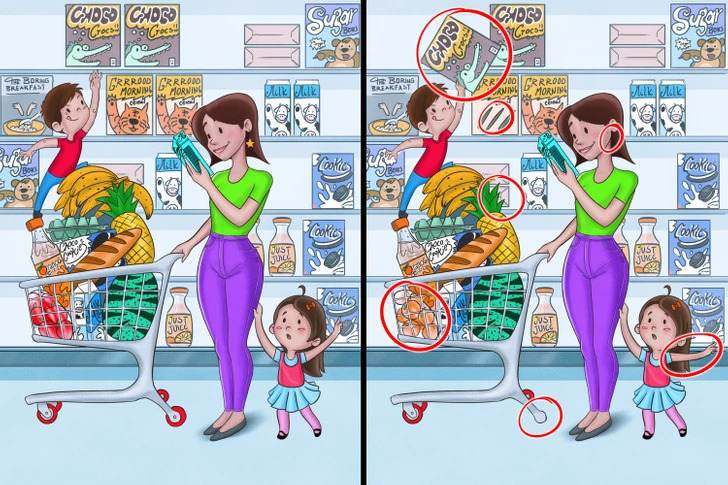 You have eagle eyes if you can spot 5 differences in the grocery shopping picture within 25 seconds!