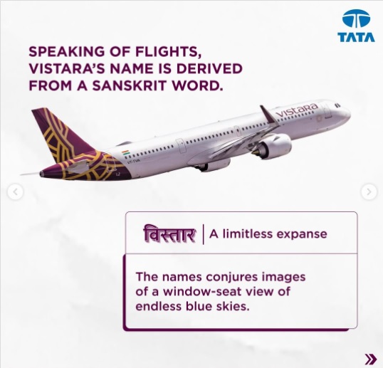 Vistara's name has been derived from a Sanskrit word, Vistaar, which means 'a limitless expanse'. "The name conjures images of a window-seat view of endless blue skies," wrote TATA Companies in an Instagram post.