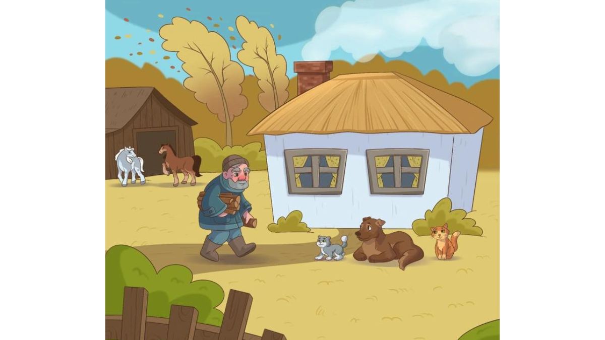 The image shows an old man, his hut, dog, cats, other animals and a regular countryside scene. Your task is to find the three mistakes hidden in the image. Now, divide the image into sections and use your skills like logical reasoning, observational power, and other abilities to conclude this mental exercise.