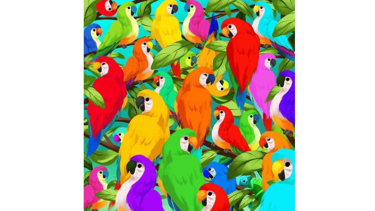 The image shows a total monochromatic picture of parrots. And your task is to find the chameleon hidden in the picture. Now divide the image into sections, go through all of them to not miss any clues and use your skills like logical reasoning, observational power, and other abilities to reach your goal.