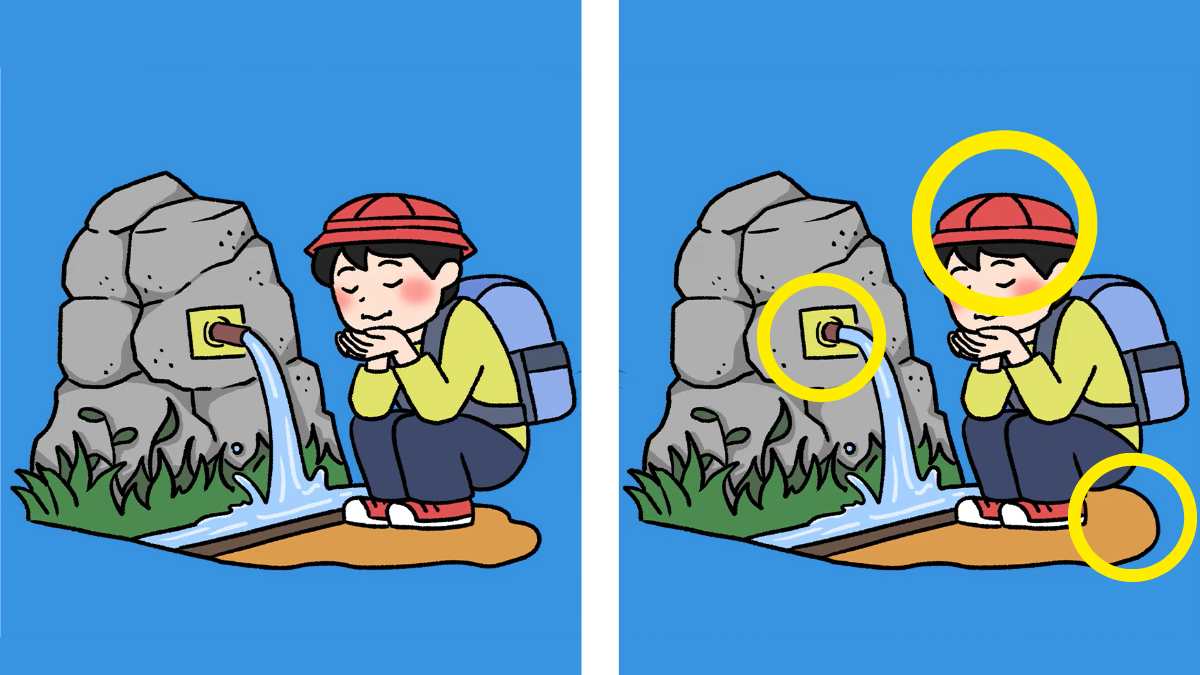 The image above depicts two identical pictures where you can see a boy drinking water from a water spout. Although the images are nearly identical, there are 3 differences between them. Can you find them all in 30 seconds?