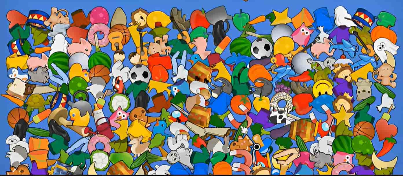In the toys present in the picture you can find fruits, vegetables, dresses, animals and so on.