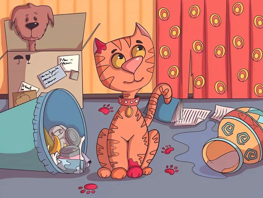 The above-shared image depicts a room scene in which you can see a cat sitting. The cat has stepped on some paint, which has made his paws red.